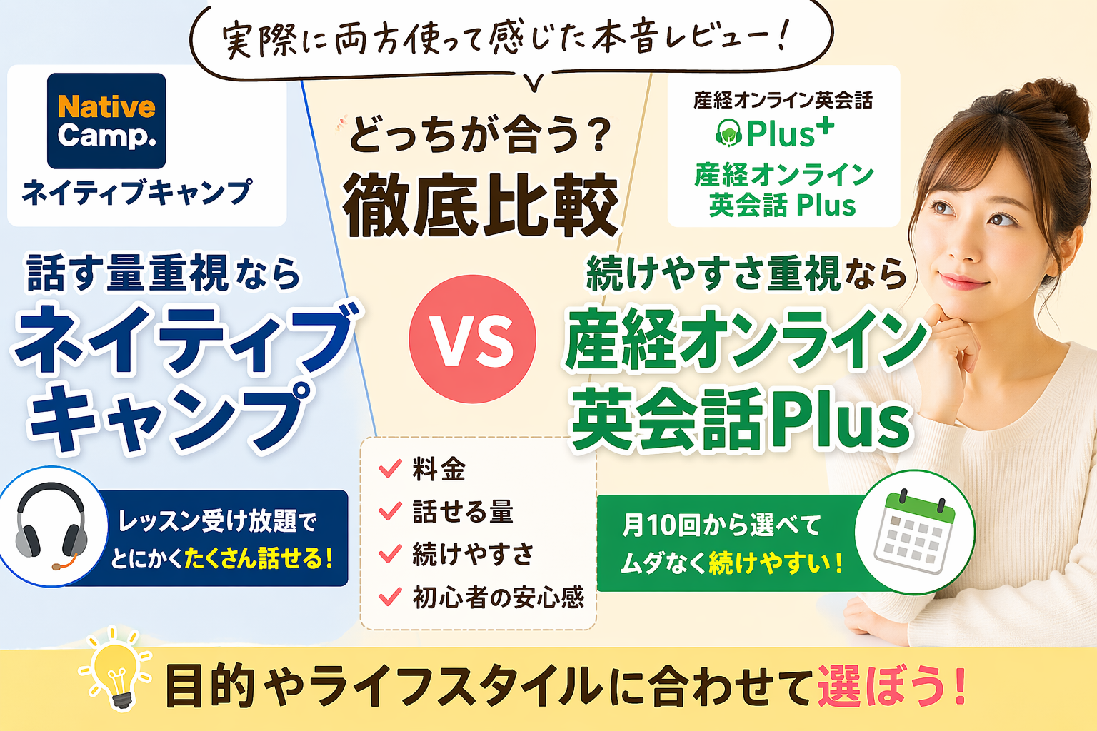 まとめ|ネイティブキャンプと産経オンライン英会話Plusは「目的」で選ぶのが正解