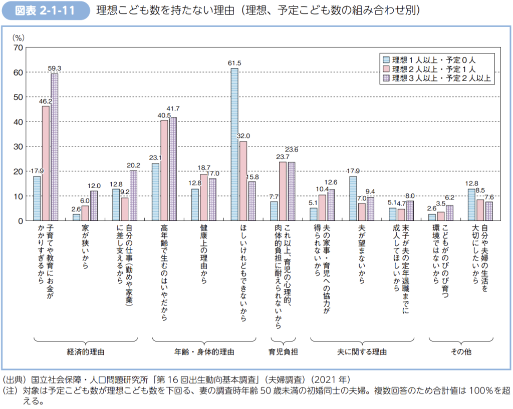 実際に、子どもを持たない理由として「経済的な不安」を挙げる人が多いことは、政府の調査でも示されています。